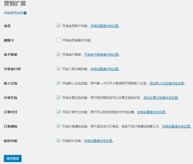 1、商家在勾选相应功能选项,并点击【保存更改】并刷新,即可开启新人红包、分享红包、分享家计划等功能,并可进入各功能具体设置;不勾选则不会在后台显示此项功能。如下图所示: