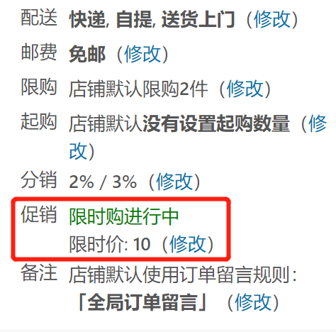 2、2019年1月起,商品编辑界面做了新的优化,邮费、限购、促销(拼团、限时购等)的设置统一调整到商品列表页面,方便商户统一设置。