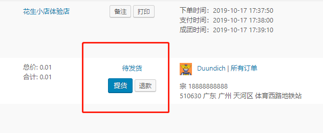 ①为买家成功提货后商家后台手动操作点击【提货】的订单