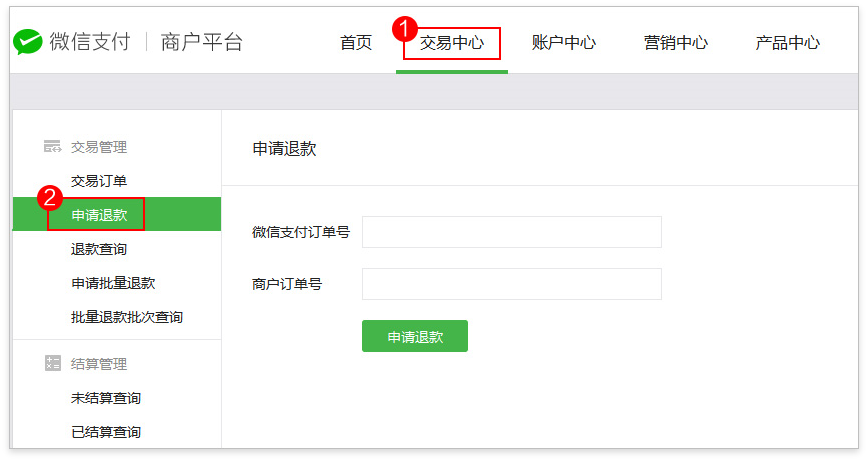 ①【登录微信商户平台(pay.weixin.qq.com)】——【交易中心】——【申请退款】,查询相应订单,确认信息后提交退款申请。详细操作流程请参阅微信交易退款方法