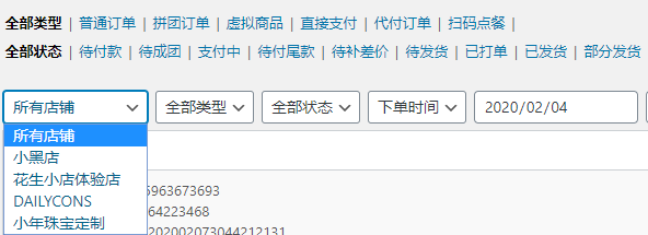 ②根据店铺进行订单筛选,后台默认显示同一账号下所有店铺的订单信息,可进行店铺筛选查看对应店铺的所有订单