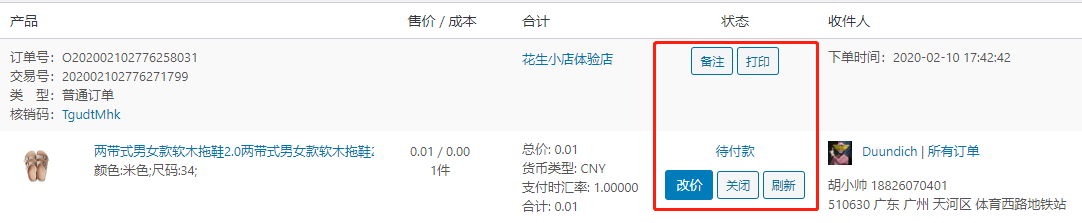 ②打印:打印该订单