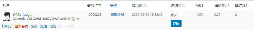 4、修改:可修改会员到期的时间,会员到期后,该会员将变为普通用户,并保留原来会员的全部数据,再次成为会员后,可继承原来的会员数据。如下图所示: